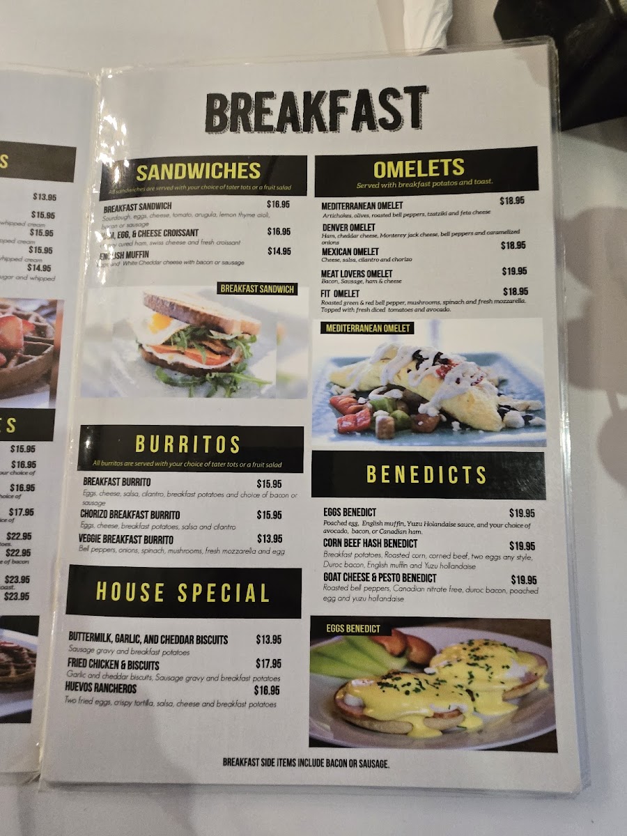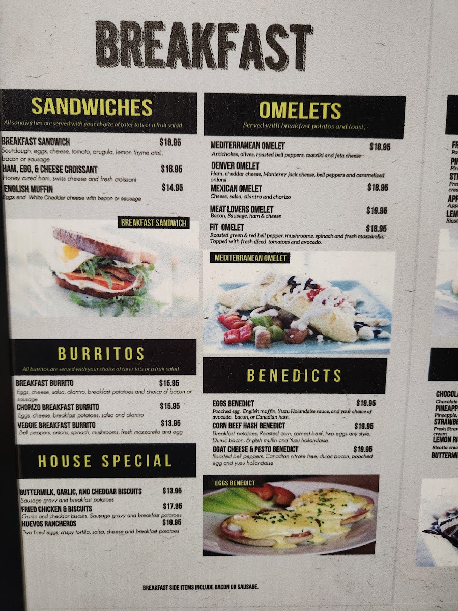 - Omelets: Varieties featuring cagefree eggs combined with fresh vegetables, cheeses, and proteins like chorizo, designed for a hearty breakfast or brunch.