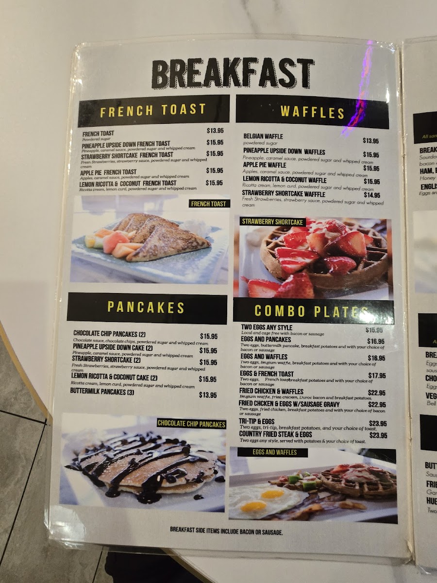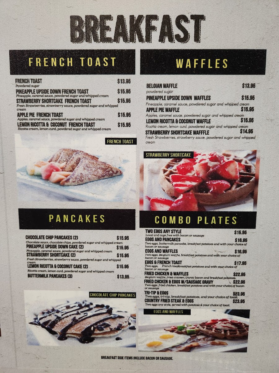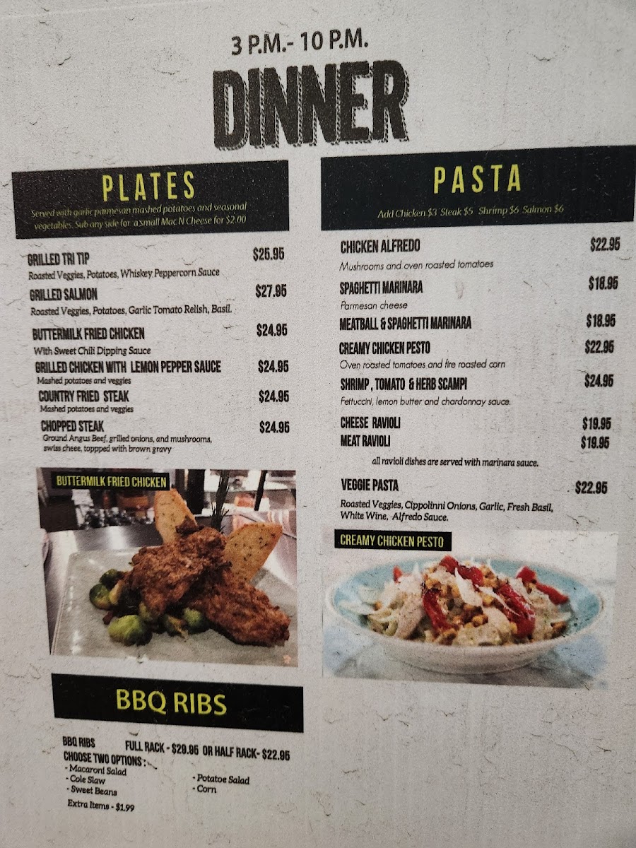 The menu supports different dining occasions, from morning meals like eggs and waffles or breakfast pot pie to lunch options such as chicken Alfredo and BBQ ribs. The available items accommodate quick service needs as well as more leisurely casual dining experiences.