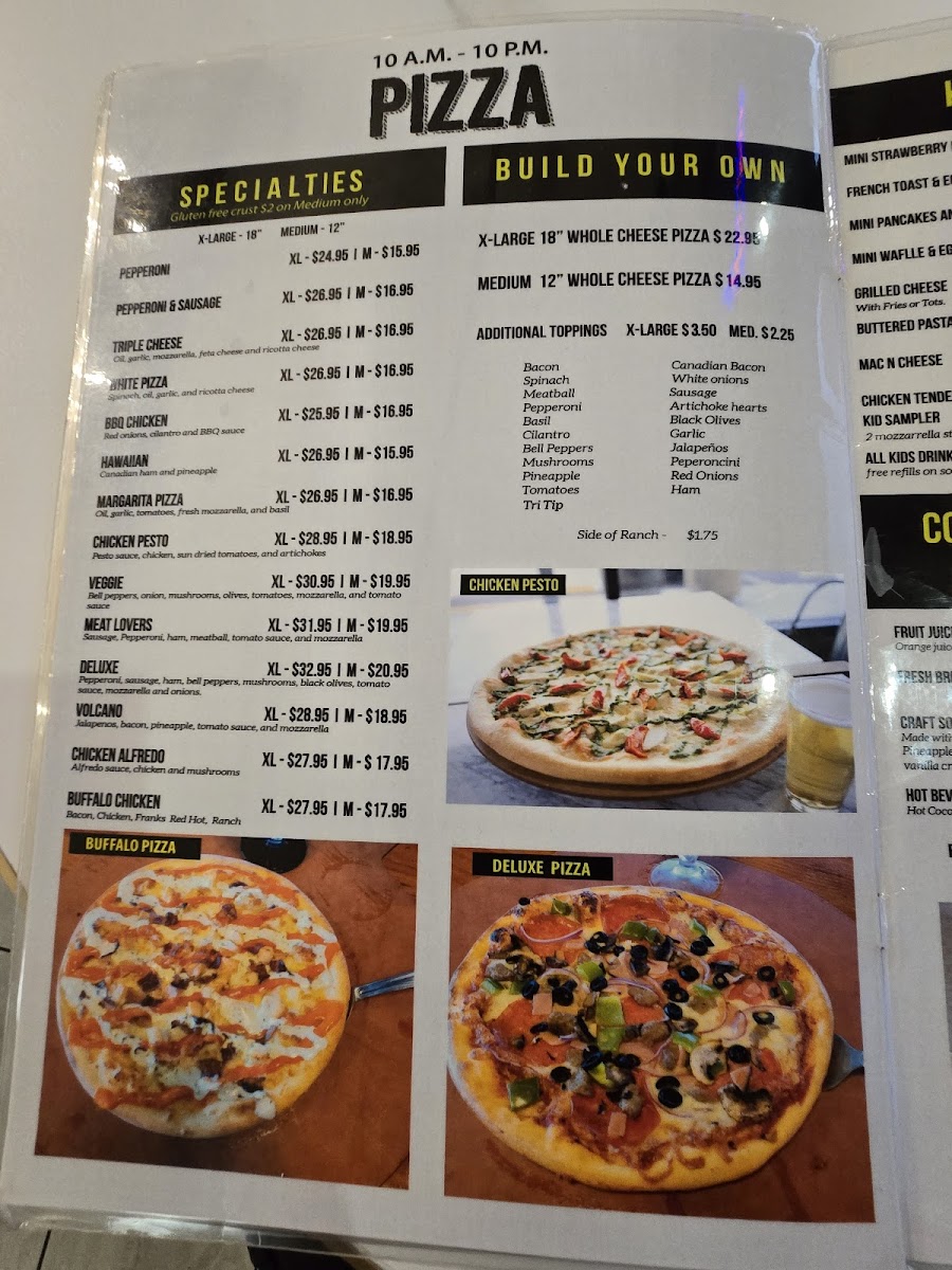- Pizza: Build-your-own pizzas available in multiple sizes, including whole cheese pizzas.